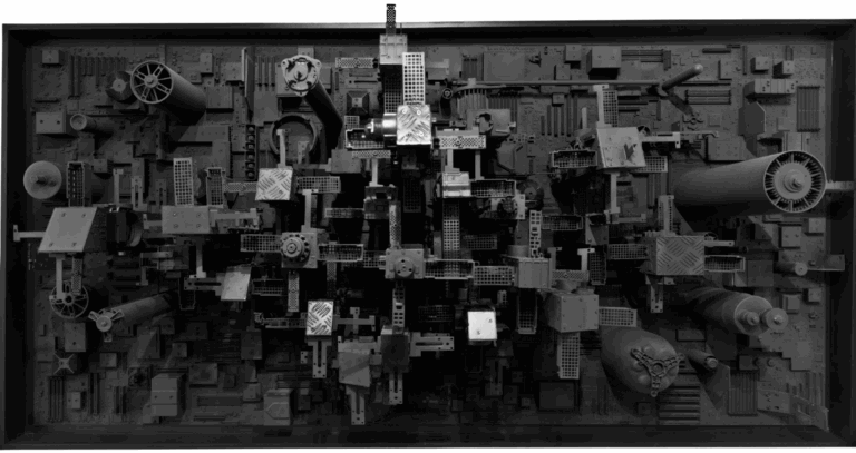 Composition de divers déchets informatiques, bois, pigments projetés /
