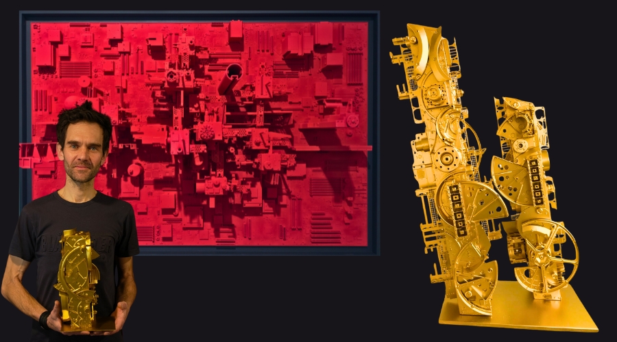 Le vol rétinien se pose sur d'étranges villes miniatures et monochromes. Noir carbonique, rouge hurlant, chrome limpide. On se pense dans l'un de ces univers dystopiques, présentant des cités fascinantes, on se remémore les Architectones de Malévitch.
